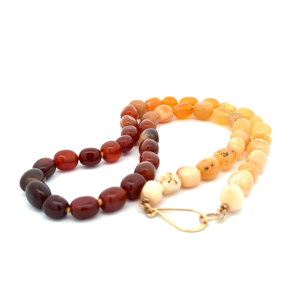 The beauty of this American Lake Fire Opal necklace is the striking warm colors, from pale yellows to reddish brown. This has been hand knotted on silk thread to create an ombre effect. The 14 karat yellow gold hand forged clasp can be worn in the back, side or front. Add a charm to the clasp and layer this necklace to create your organic look.